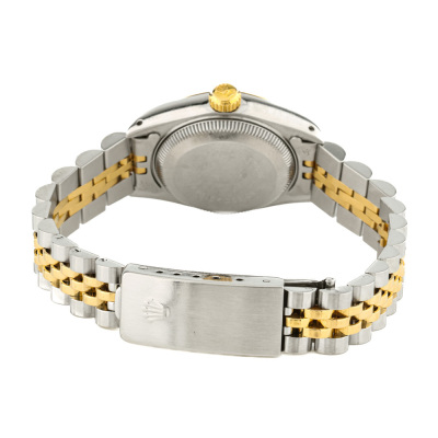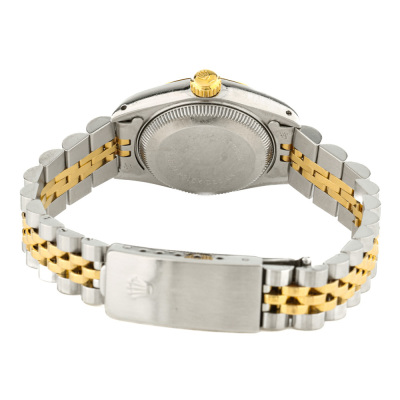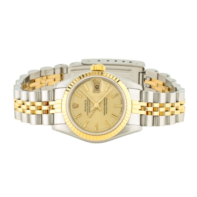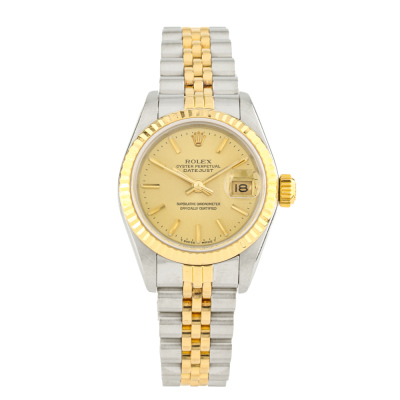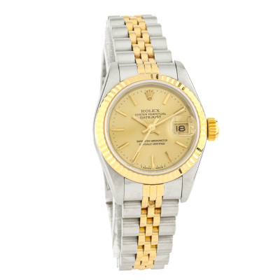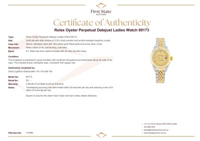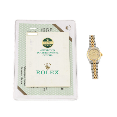 Rolex Oyster Perpetual Datejust stainless steel automatic ladies watch. Gold dial, date, case diameter: 26mm, wrist size: 16.5cm, Swiss made. Ref# 69173. Circa: 1986. With Rolex two-tone Jubilee bracelet and clasp. With Certificate of Authenticity, Rolex Guarantee Certificate dated 16/01/1987, Rolex International Service Guarantee Certificate dated 01/01/2005 and Rolex Box. 3 month FSA warranty. Weight: 55.5g.