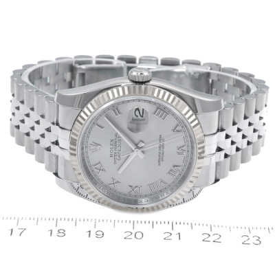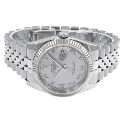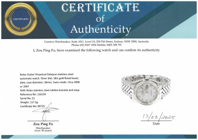 Rolex Oyster Perpetual Datejust stainless steel automatic mens watch. Silver dial, 18ct gold fluted bezel, date, case diameter: 36mm, wrist size: 18.5cm, Swiss made. Ref# 116234, Circa 2006 or 2007. With Rolex stainless steel Jubilee bracelet and clasp. With Certificate of Authenticity, Rolex Guarantee Certificate dated 12/2006 and Rolex box. 3 month FSA warranty. (Pre-owned)
