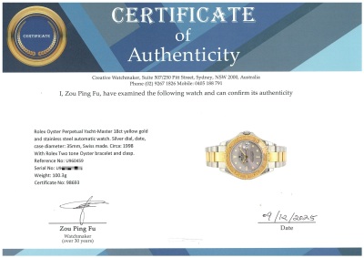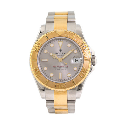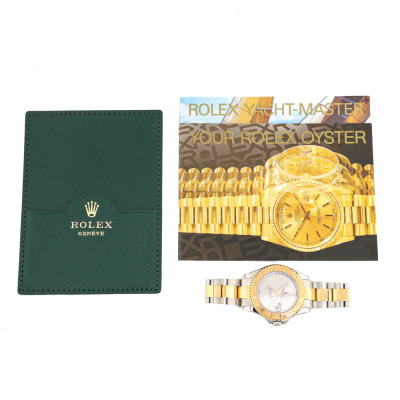 Rolex Oyster Perpetual Yacht-Master 18ct yellow gold and stainless steel automatic watch. Silver dial, date, case diameter: 35mm, wrist size: 16.5cm, Swiss made. Ref# 68623. Circa: 1998. With Rolex Two tone Oyster bracelet and clasp. With Certificate of Authenticity, Rolex Guarantee Certificate dated 04/05/1999 and Rolex box. 3 month FSA warranty. Weight: 100.3g (Pre-owned)