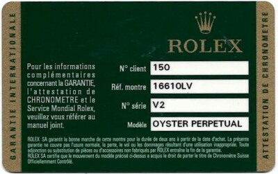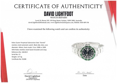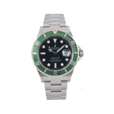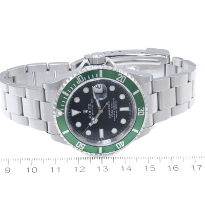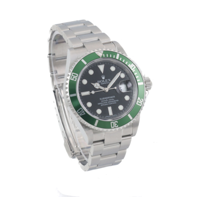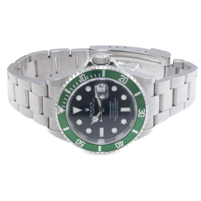 Rolex Oyster Perpetual Submariner Date 'Kermit' stainless steel automatic mens watch. Black dial, date, case diameter: 40mm, wrist size: 20cm, Swiss made. Ref# 16610LV, Circa: 2008 or 2009. With Rolex Oyster stainless steel bracelet and clasp. With Certificate of Authenticity, Rolex International Guarantee card dated 12/10/2010 and Rolex box. 3 month FSA warranty. (Pre-owned)
