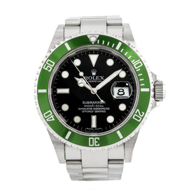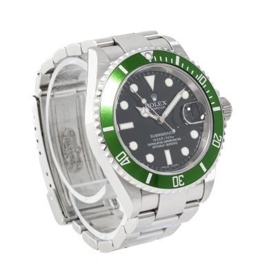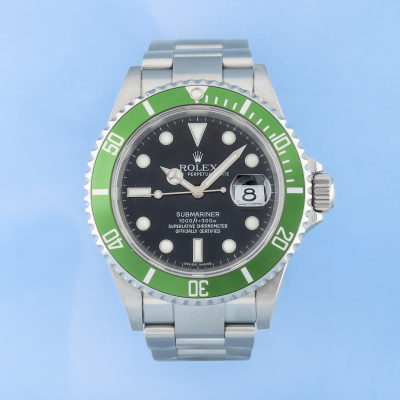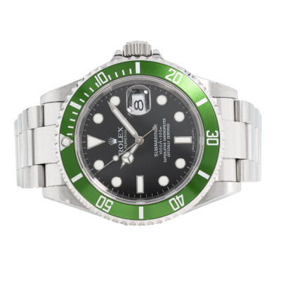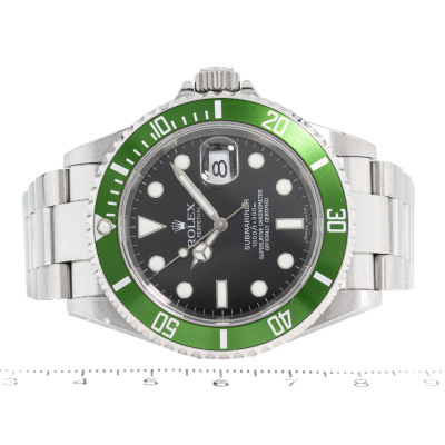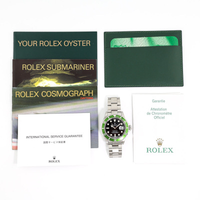 Rolex Oyster Perpetual Submariner Date Kermit stainless steel automatic mens watch. Black dial, date, case diameter: 40mm, wrist size: 17cm, Swiss made. Ref# 16610LV, Circa: 2006 or 2007. With Rolex stainless steel Oyster bracelet and clasp. With Certificate of Authenticity, Rolex Guarantee Certificate dated 07/01/2007, Rolex International Guarantee Service card dated 12/05/2016 and Rolex box. 3 month FSA warranty. (Pre-owned)
