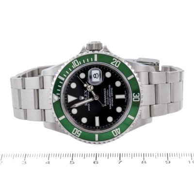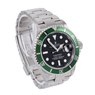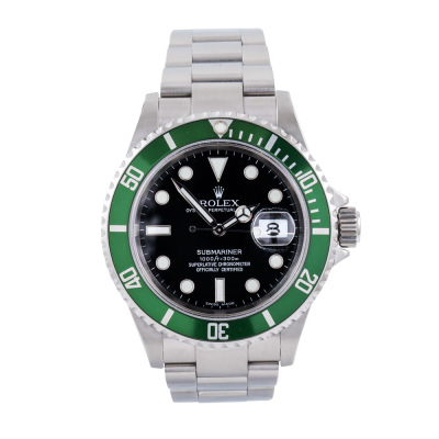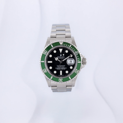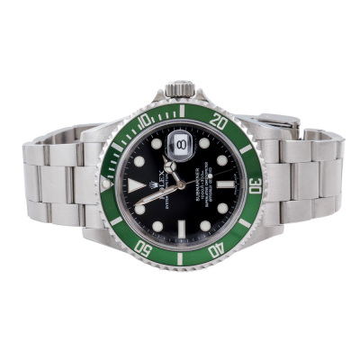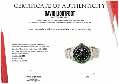 Rolex Oyster Perpetual Submariner Date Kermit stainless steel automatic mens watch. Black dial, date, case diameter: 40mm, wrist size: 19cm, Swiss made. Ref# 16610LV, Circa: 2005 or 2006. With Rolex stainless steel Oyster bracelet and clasp. With Certificate of Authenticity and Rolex box. 12 month David Lightfoot Watch Repair warranty from the date of full service. Weight: 134.9g (Pre-owned)