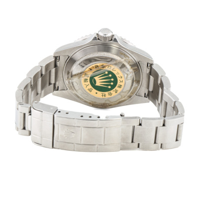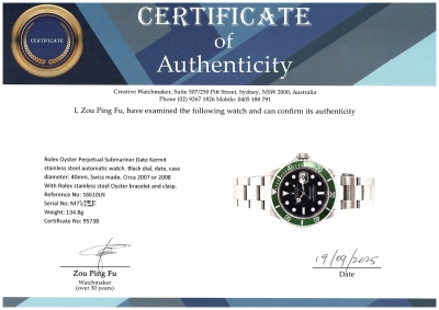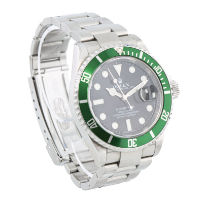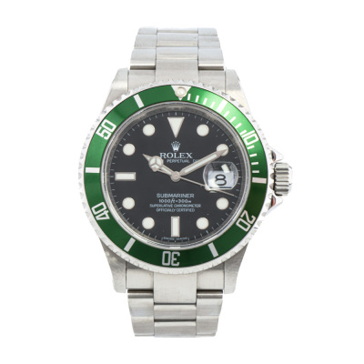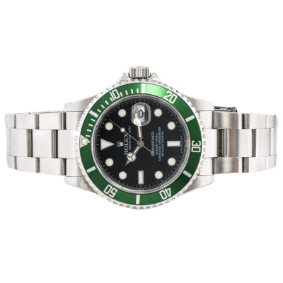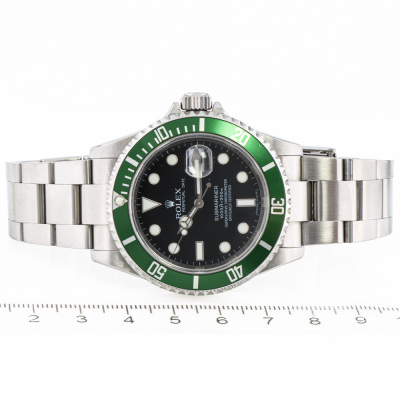 Rolex Oyster Perpetual Submariner Date Kermit stainless steel automatic mens watch. Black dial, date, case diameter: 40mm, wrist size: 18.5cm, Swiss made. Ref# 16610LV. Circa 2007 or 2008. With Rolex stainless steel Oyster bracelet and clasp. With Certificate of Authenticity and Rolex box. 3 month FSA warranty. Weight: 134.8g (Pre-owned)