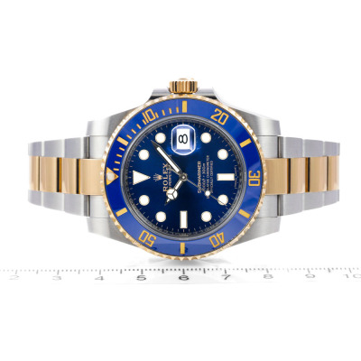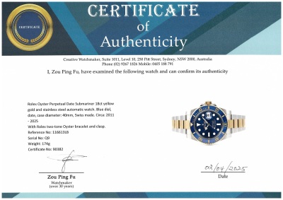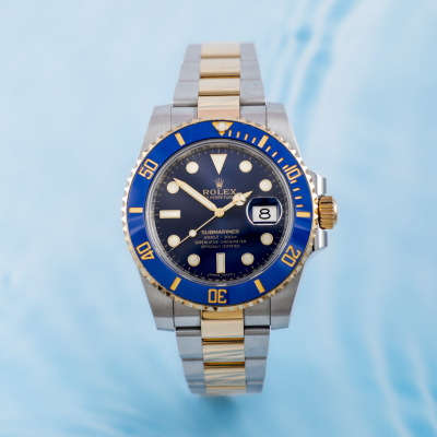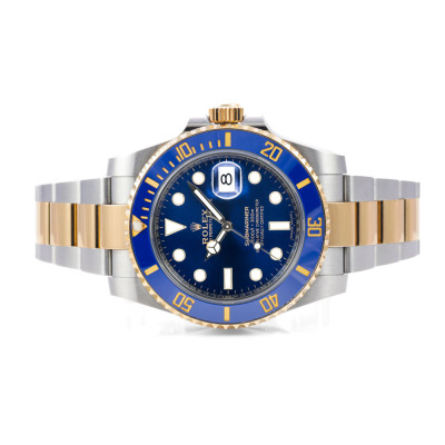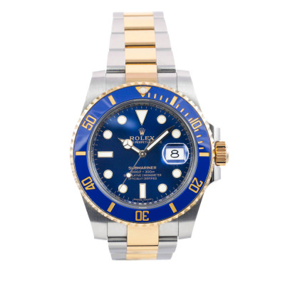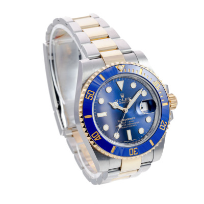 Rolex Oyster Perpetual Date Submariner 18ct yellow gold and stainless steel automatic mens watch. Blue dial, date, case diameter: 40mm, wrist size: 20cm, Swiss made. Ref# 116613LB. Circa: 2011 - 2025. With Rolex two-tone Oyster bracelet and clasp. With Certificate of Authenticity, Rolex International Warranty card dated 23/02/20218 and Rolex box. 3 month FSA warranty (Pre-owned)