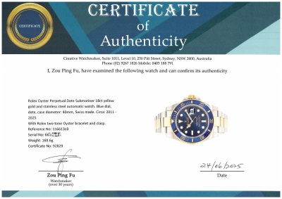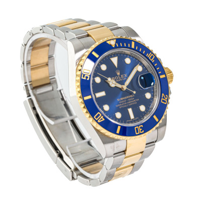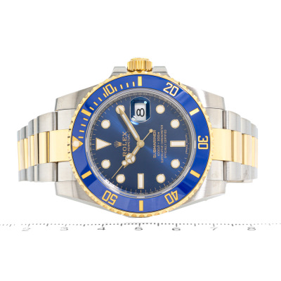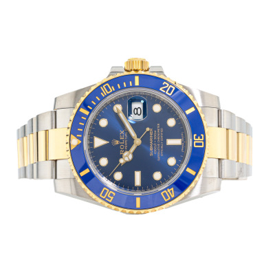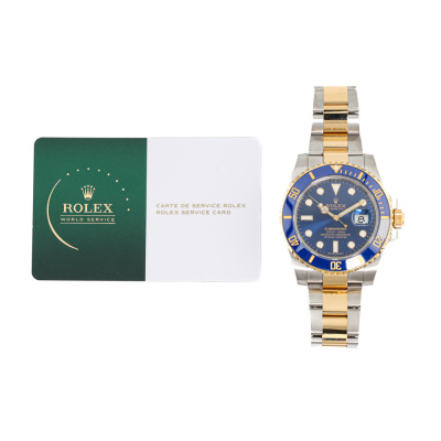 Rolex Oyster Perpetual Date Submariner 18ct yellow gold and stainless steel automatic mens watch. Blue dial, date, case diameter: 40mm, wrist size: 18.5cm, Swiss made. Ref# 116613LB. Circa: 2011 - 2025. With Rolex two-tone Oyster bracelet and clasp. With Certificate of Authenticity, Rolex Service card valid until 03/2027 and Rolex case. Balance of 2 year warranty from the date of Rolex Complete service. (Pre-owned)