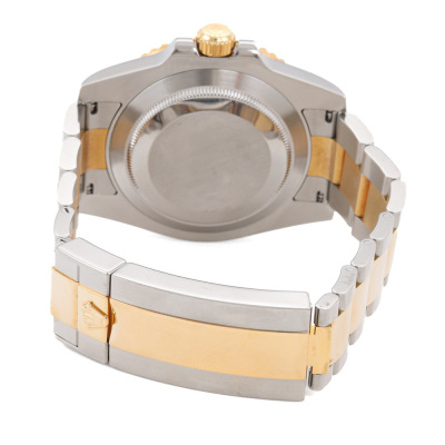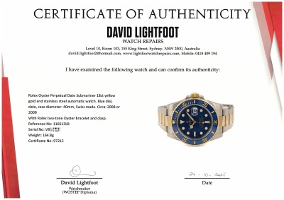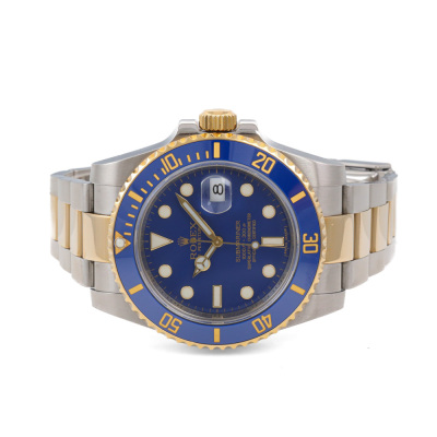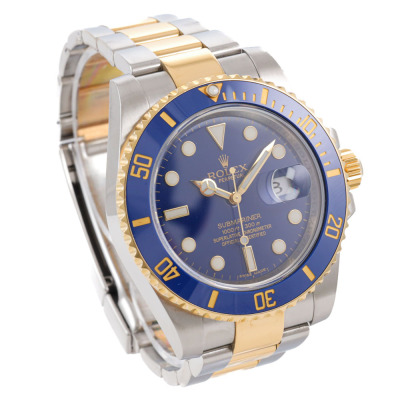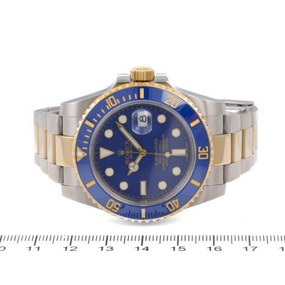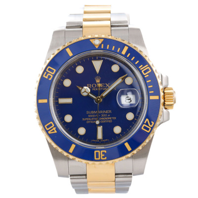 Rolex Oyster Perpetual Date Submariner 18ct yellow gold and stainless steel automatic mens watch. Blue dial, date, case diameter: 40mm, wrist size: 18.5cm, Swiss made. Ref# 116613LB. Circa: 2008 or 2009. With Rolex two-tone Oyster bracelet and clasp. With Certificate of Authenticity and Rolex box. 3 month FSA warranty. Weight: 164.8g. (Pre-owned)