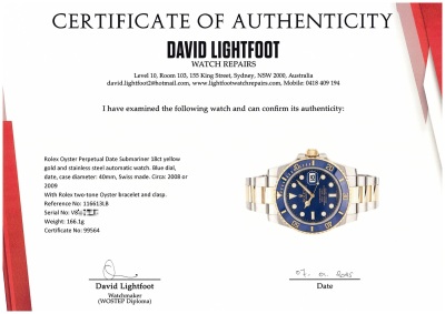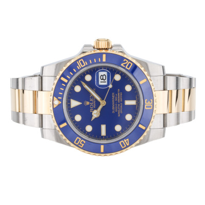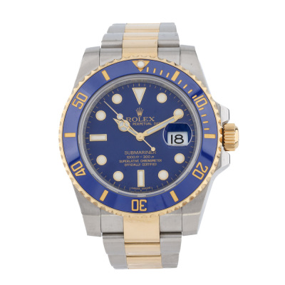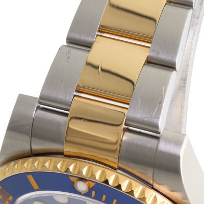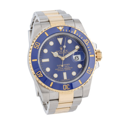 Rolex Oyster Perpetual Date Submariner 18ct yellow gold and stainless steel automatic mens watch. Blue dial, date, case diameter: 40mm, wrist size: 18.5cm, Swiss made. Ref# 116613LB. Circa: 2008 or 2009. With Rolex two-tone Oyster bracelet and clasp. With Certificate of Authenticity and Rolex box with gift bag. 3 month FSA warranty. Weight: 166.1g. (Pre-owned)