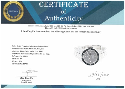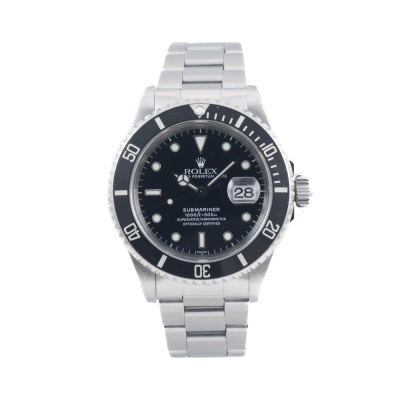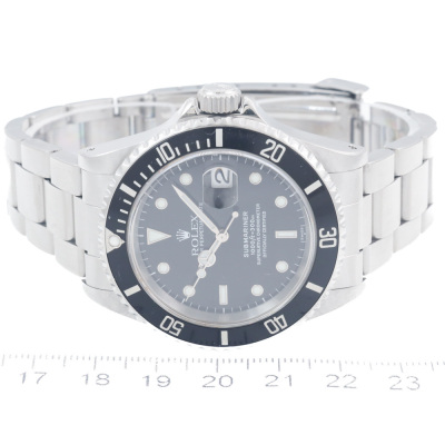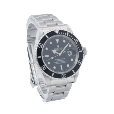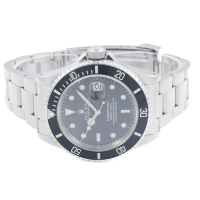 Rolex Oyster Perpetual Submariner Date stainless steel automatic mens watch. Black dial, date, case diameter: 40mm, wrist size: 19.5cm, Swiss made. Ref# 16610. Circa: 1997. With Rolex stainless steel Oyster bracelet and clasp. With Certificate of Authenticity and Rolex box. 3 month FSA warranty (Pre-owned)