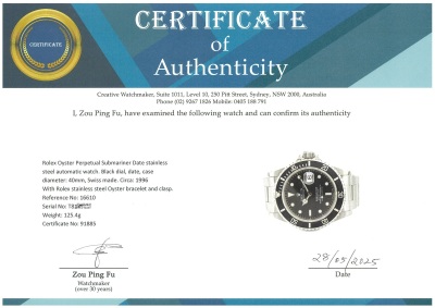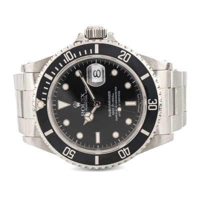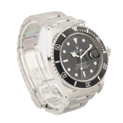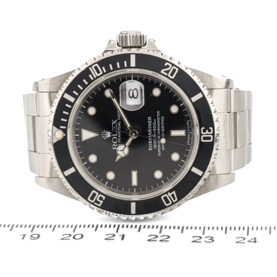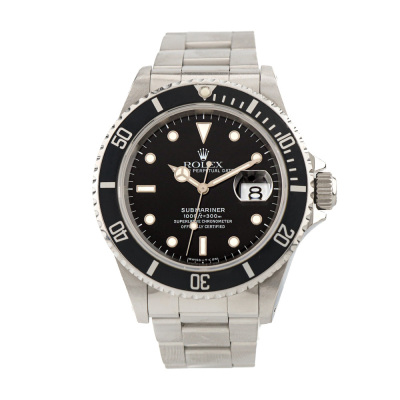 Rolex Oyster Perpetual Submariner Date stainless steel automatic mens watch. Black dial, date, case diameter: 40mm, wrist size: 18cm, Swiss made. Ref# 16610. Circa: 1996. With Rolex stainless steel Oyster bracelet and clasp. With Certificate of Authenticity and Rolex box with Rolex gift bag. 3 month FSA warranty. (Pre-owned)