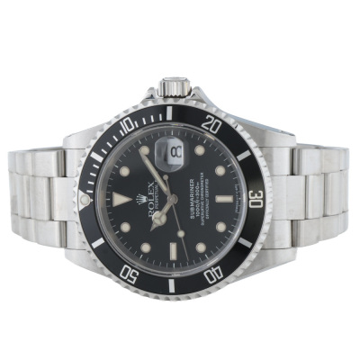 Description Updated - Rolex Oyster Perpetual Submariner Date stainless steel automatic mens watch. Black dial, date, case diameter: 40mm, max wrist size: 18cm, Swiss made. Ref# 16610. With Rolex stainless steel Oyster bracelet and clasp. With Certificate of Authenticity and Rolex box. 3 month FSA warranty. Weight: 129.3g