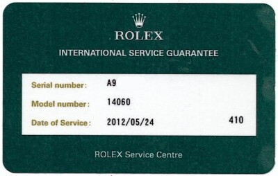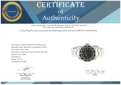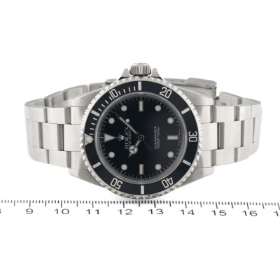 Rolex Oyster Perpetual Submariner stainless steel automatic mens watch. Black dial, case diameter: 40mm, wrist size: 18cm, Swiss made. Ref #14060. Circa: 1999. With Rolex stainless steel Oyster bracelet and clasp. With Certificate of Authenticity, Rolex International Service card dated 24/05/2012 and Rolex box. 3 month FSA warranty (Pre-owned)