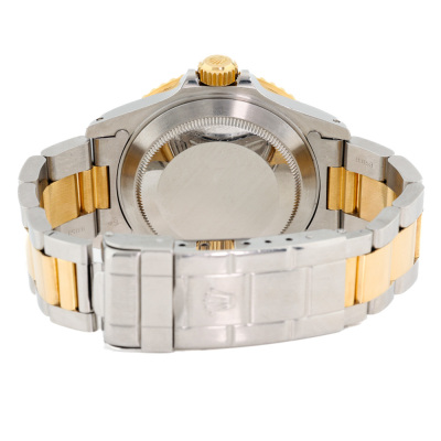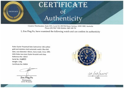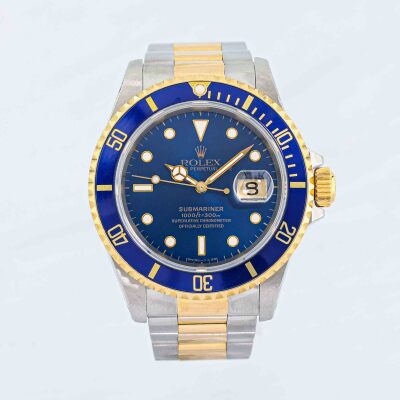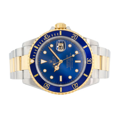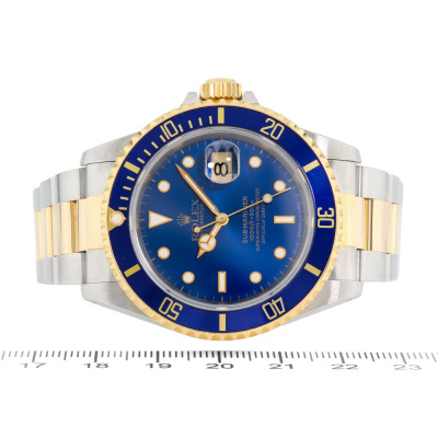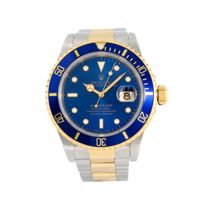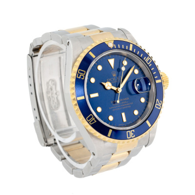 Rolex Oyster Perpetual Date Submariner 18ct yellow gold and stainless steel automatic mens watch. Blue dial, date, case diameter: 40mm, max wrist size: 16.5cm, Swiss made. Ref# 16613. Circa: 1991. With Rolex two-tone Oyster bracelet and clasp. With Certificate of Authenticity and Rolex box. 3 month FSA warranty. (Pre-owned)