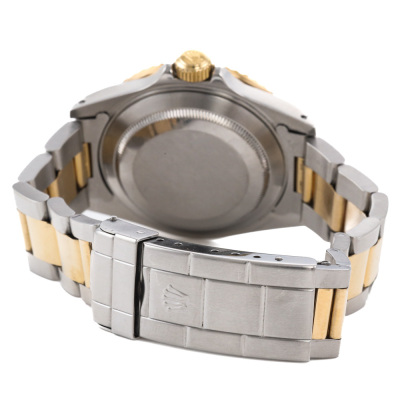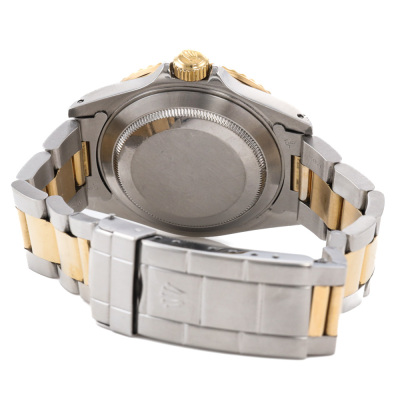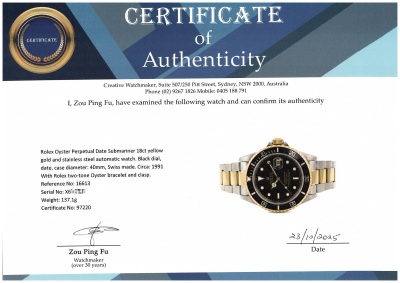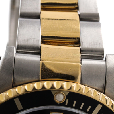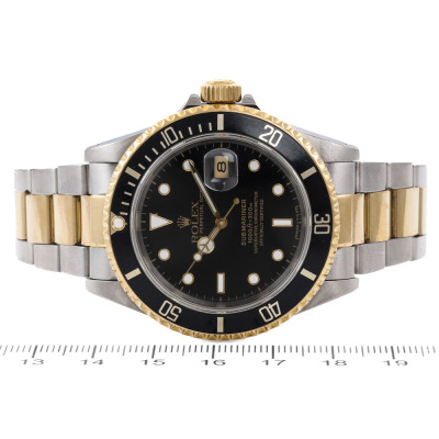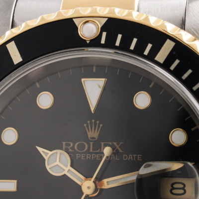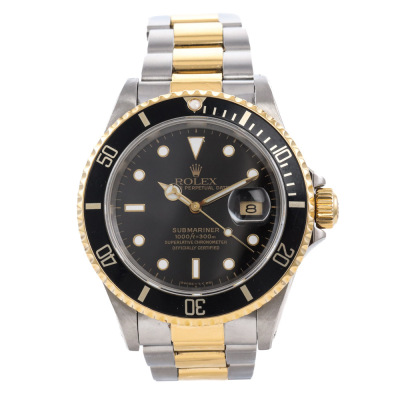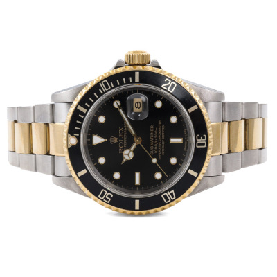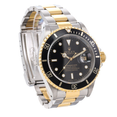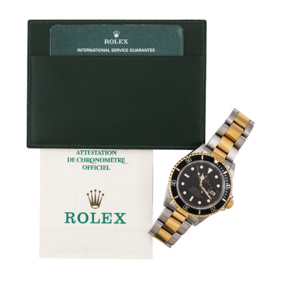 Rolex Oyster Perpetual Date Submariner 18ct yellow gold and stainless steel automatic mens watch. Black dial, date, case diameter: 40mm, wrist size: 19.5cm, Swiss made. Ref# 16613. Circa: 1991. With Rolex two-tone Oyster bracelet and clasp. With Certificate of Authenticity, Rolex Guarantee Certificate dated 15/12/1993, Rolex International Guarantee Service card dated 16/06/2010 and Rolex box . 3 month FSA warranty. Weight: 137.1g (Pre-owned)