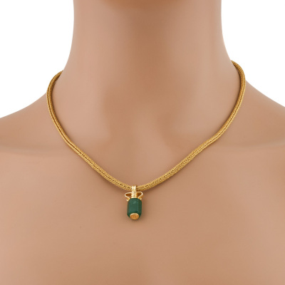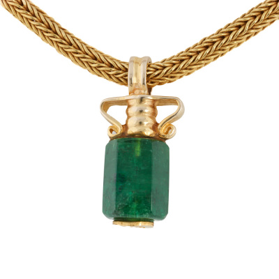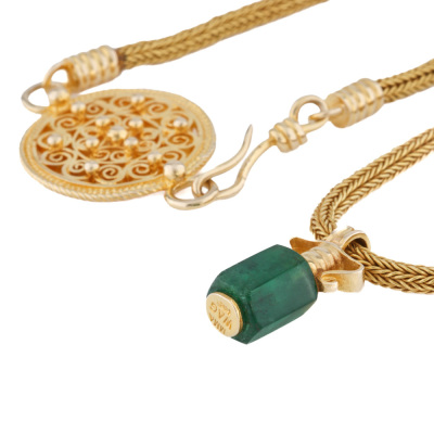 Roman style emerald pendant and mesh link chain necklace. With hexagonal Natural Emerald bead of size 10.5mm x 8.3mm. 14ct yellow gold pendant with 22ct chain and 14ct yellow gold hook & filigree disc. Pendant height: 2.2cm. Disc diameter: 2.3cm. Length of necklace: 47cm. Weight: 35.4g. With the Metropolitan Museum of Art case and card.