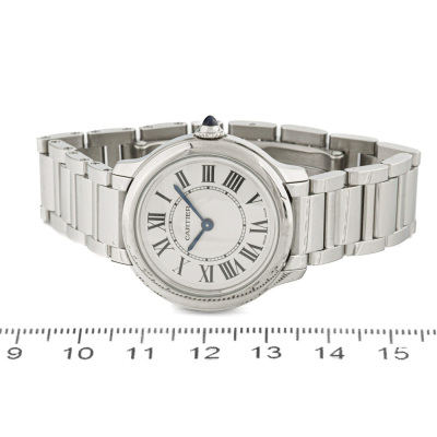 Ronde Must de Cartier stainless steel quartz ladies watch. Silver dial, case diameter: 29mm, wrist size: 14cm, Swiss made. Ref# WSRN0033/4422. With Cartier stainless steel bracelet and clasp. With Certificate of Authenticity and Cartier pouch. 3 month FSA warranty. (Pre-owned)