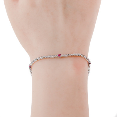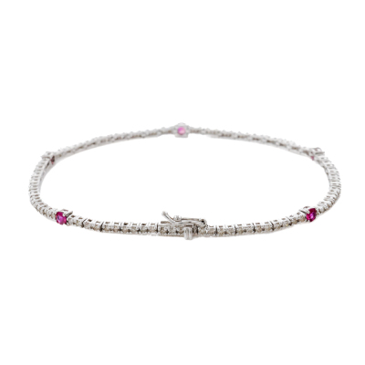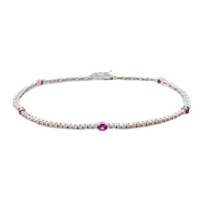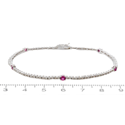 Ruby and Diamond bracelet with 5 round Natural Rubies totalling 0.40ct and round Natural Diamonds totalling 0.80ct (Estimated grading: I-J P1). 18ct white gold. Length: 18cm. Weight: 5.0g. (Pre-owned)