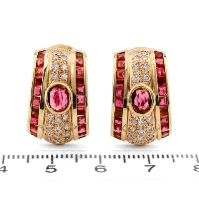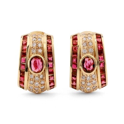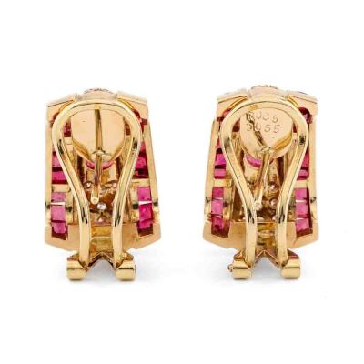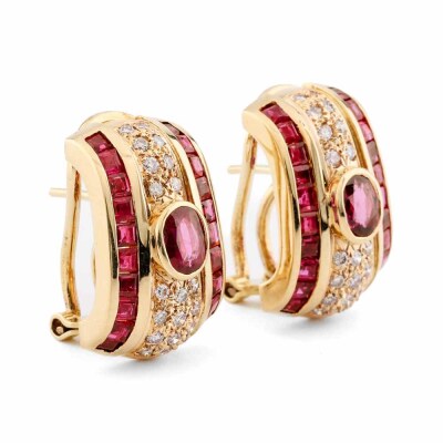 Ruby and Diamond clip-on earrings (for pierced ears) with oval & carre cut Natural Rubies totalling 0.85ct and round Natural Diamonds totalling 0.55ct (Estimated grading: I-J SI). 18ct yellow gold. Weight: 14.5g. (Pre-owned)
