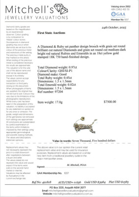 Ruby and Diamond Panther design brooch with round Natural Rubies totalling approximately 0.45ct, 2 round Natural Emerald eyes totalling approximately 0.02ct and round Natural Diamonds totalling 0.97ct including attached tie pin (Estimated grading: GHI SI-P1). 18ct yellow gold. Weight: 17.0g. With Valuation Certificate #421818.