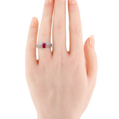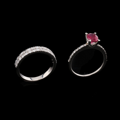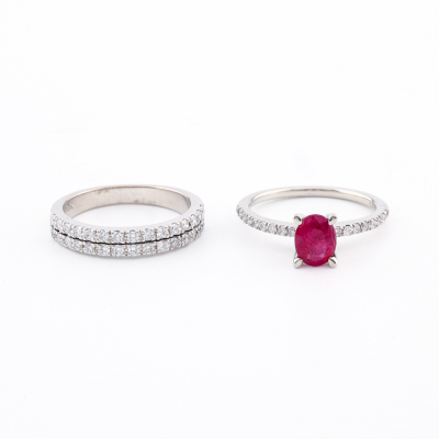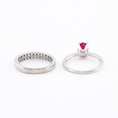 Ruby and Diamond ring set. 1) Ruby and Diamond ring with centre oval shape Natural Ruby of 0.75ct and 16 round Natural Diamonds totalling 0.14ct. Platinum 950 (XRF tested, stamped 'Pt'). Ring size: J1/2. Band width: 1.2mm - 1.4mm. 2) Two row Diamond ring band with 30 round natural Diamonds totalling 0.30ct (Estimated grading: G-H SI). 18ct white gold. Ring size J 1/2. Band width: 2.5mm - 3.2mm. Total weight: 6.3g. (Pre-owned)