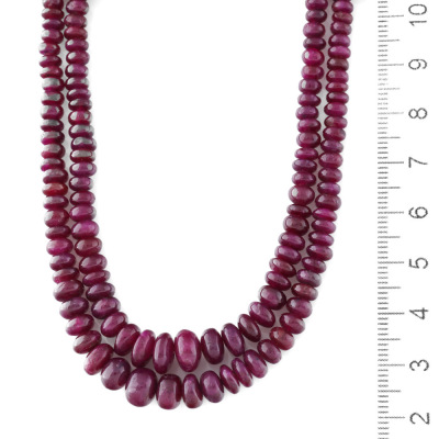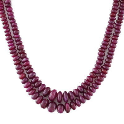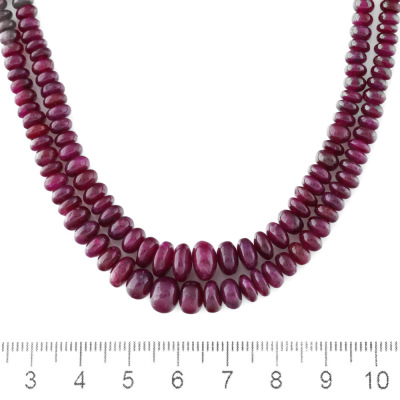 Two row necklace with graduated Natural Ruby beads of size 8.1mm - 2.6mm. 18ct yellow gold clasp set with round Natural Diamonds totalling approximately 0.48ct (Estimated grading: H-I SI). Length: 46cm. Weight: 45.9g. (Pre-owned)