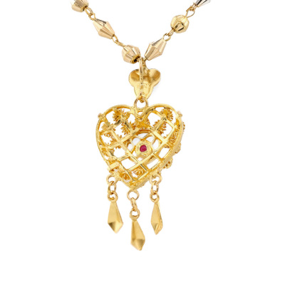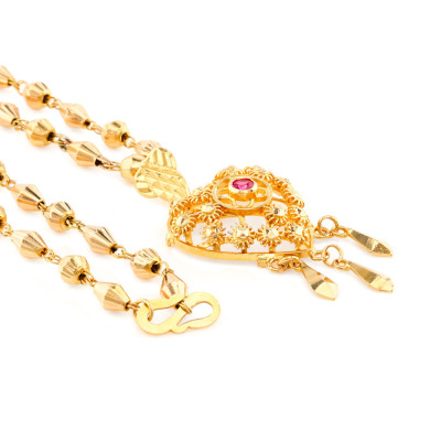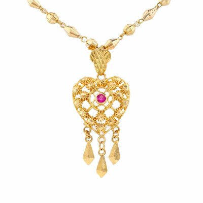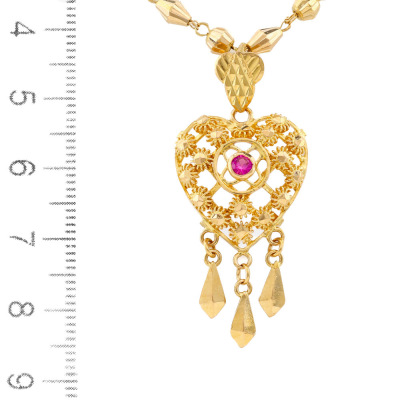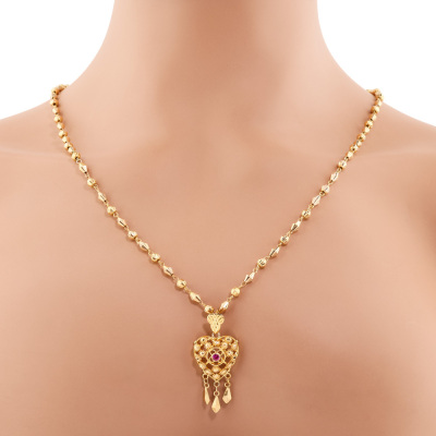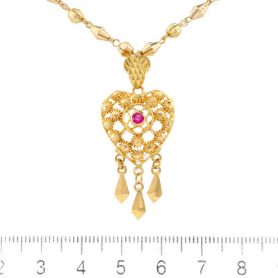 Ruby pendant with a round Natural Ruby of approximately 0.10ct. 22ct yellow gold with 18ct yellow gold (as XRF tested but stamped 22k) chain. Length: approximately 60cm. Weight: 17.4g. (Pre-owned)