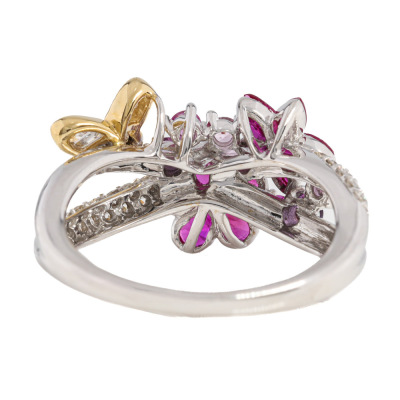 Flower and butterfly design ring with pear & marquise cut Natural Rubies totalling approximately 1.05ct, round pink Natural Sapphires totalling 0.27ct and round & baguette cut Natural Diamonds totalling 0.32ct (Estimated grading: H SI). 18ct yellow & white gold. Ring size M1/2. Band width: 1.6mm-5.2mm. Weight: 5.5g. (Pre-owned)