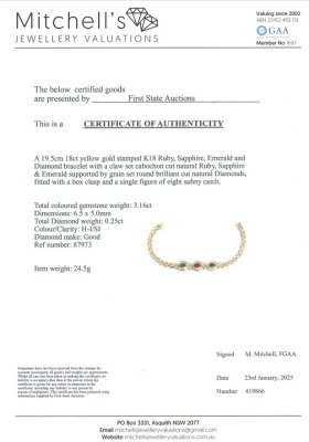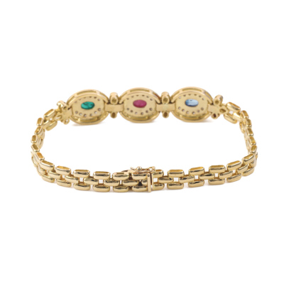 Ruby, Sapphire and Emerald and Diamond bracelet with oval cabochon shape Natural Ruby, Natural Blue Sapphire & Natural Emerald totalling 3.16ct and round Natural Diamonds totalling 0.25ct. Length: 19.5cm. Weight: 24.5g. With Certificate #419866. (Pre-owned)