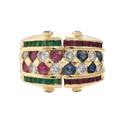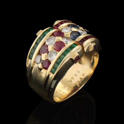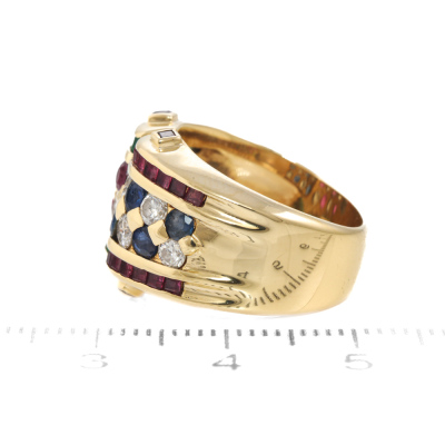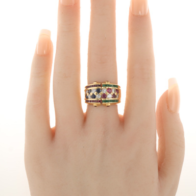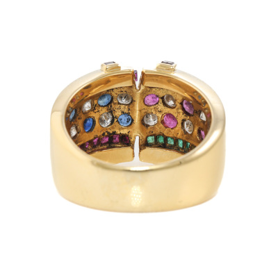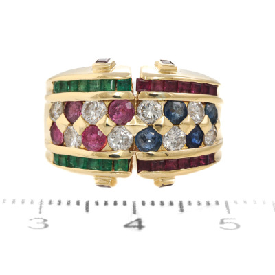 Multi-colour Gemstone and Diamond ring with round & carre cut Natural Ruby totalling 1.10ct, round Natural Blue Sapphire totalling 0.46ct, carre cut Natural Emerald totalling 0.30ct and round Natural Diamonds totalling 0.67ct (Estimated grading: H SI). 18ct yellow gold. Ring size K½. Band width: 6mm - 8.3mm. Weight: 11.9g. (Pre-owned)