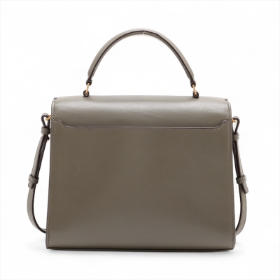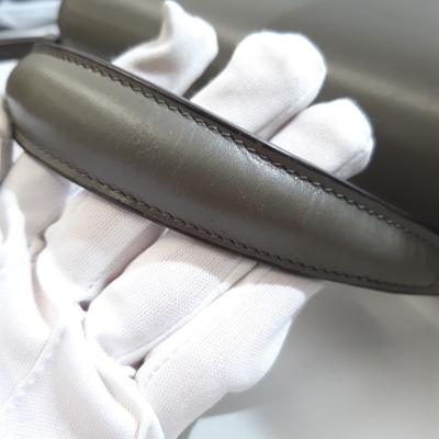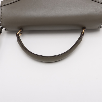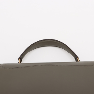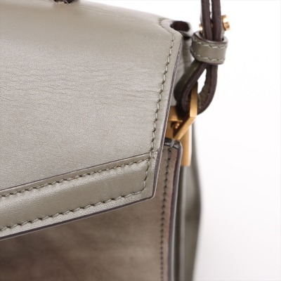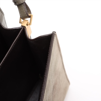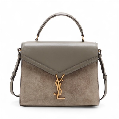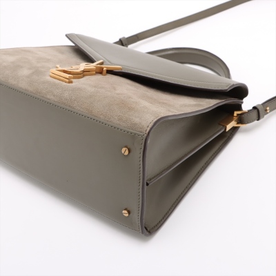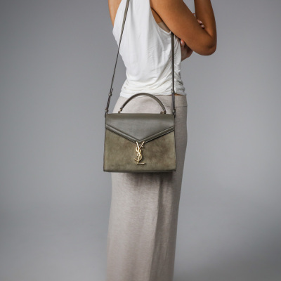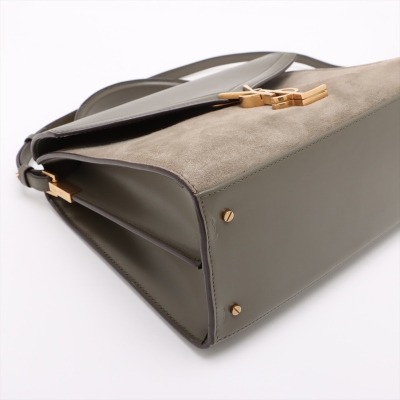 Saint Laurent medium Cassandra top handle bag in khaki green leather and light green suede. Featuring aged gold-toned hardware, exterior pocket at back, and a single leather top handle. The frontal flap with pivoting YSL closure opens to a dark brown leather-lined interior with two compartments and a patch pocket. Approximate dimensions: 24.5cm(B-L) x 20cm(H) x 11.5cm(D), 3.5cm handle drop and 53.5cm detachable strap drop. With Entrupy Certificate of Authenticity. (Pre-owned)
