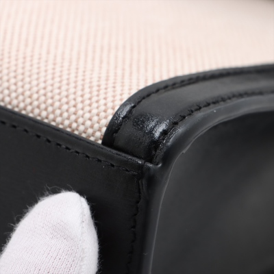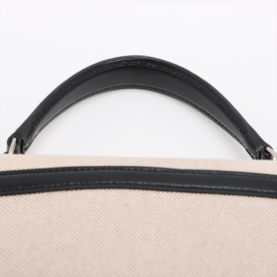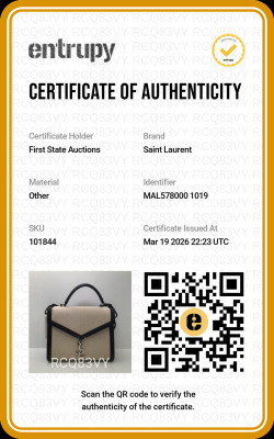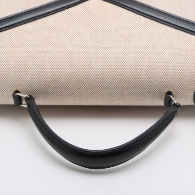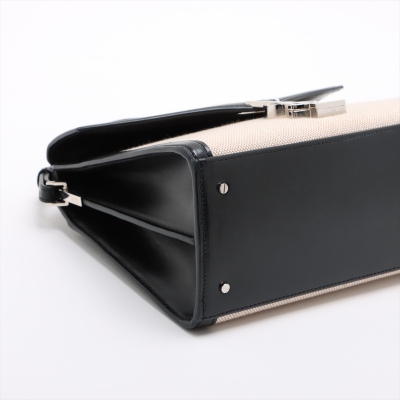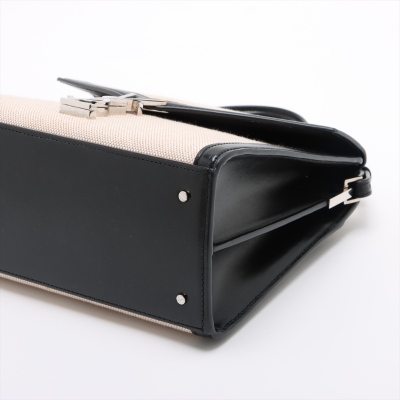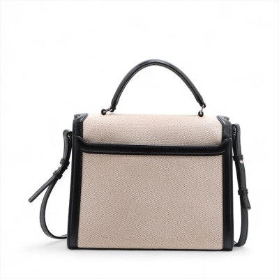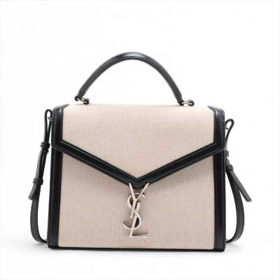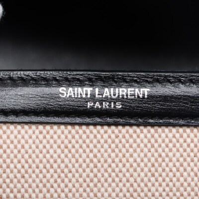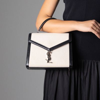 Saint Laurent medium Cassandra bag in beige canvas and black leather trim. Featuring silver-toned hardware, a rear exterior pocket, a single leather top handle and detachable leather strap. The frontal flap with pivoting YSL closure opens to a black microfibre interior with two compartments and a patch pocket. Approximate dimensions: 24.5cm(base-W) x 20cm(H) x 10cm(D), with a 7.5cm handle drop and 50cm adjustable strap drop. With Entrupy Certificate of Authenticity.