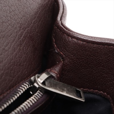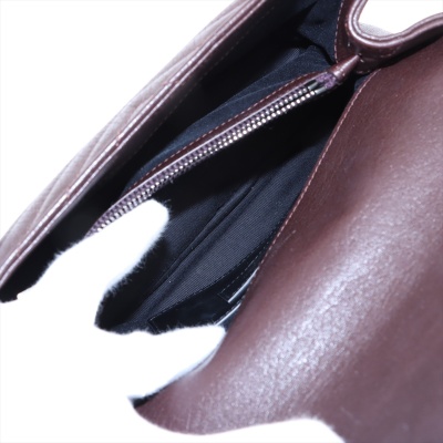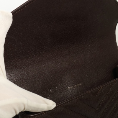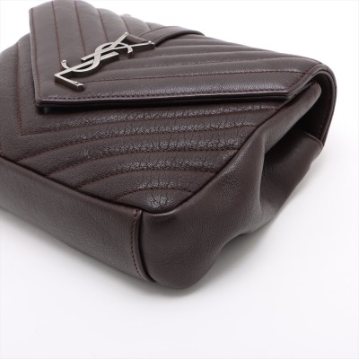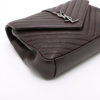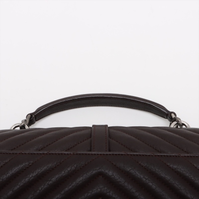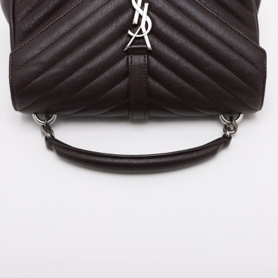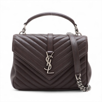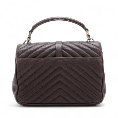 Saint Laurent Medium College bag in brown chevron-quilted calfskin leather. Featuring aged silver-toned hardware, YSL logo plaque at front, a leather top handle, a detachable leather & chain strap, and an exterior slip pocket at back. The magnetic button on front flap opens to a black-textile lined interior with two compartments, a leather zippered pocket and a card slot. Approximate dimensions: 23.5cm(W) x 16.5cm(H) x 5.5(D), with a 6.5cm handle drop, and 57.5cm chain strap drop. With Entrupy Certificate of Authenticity.