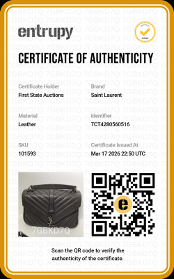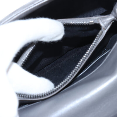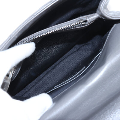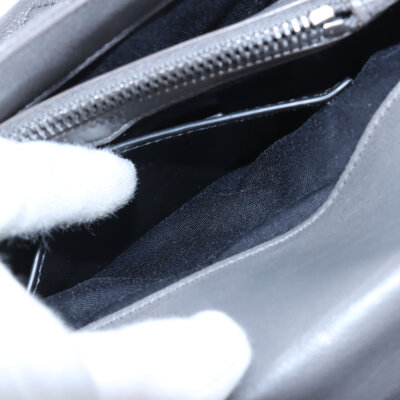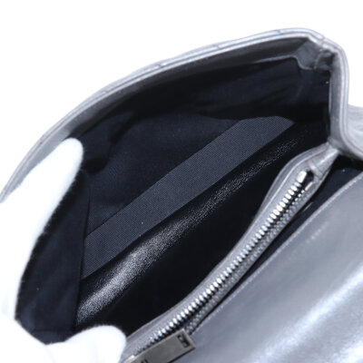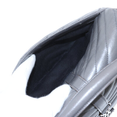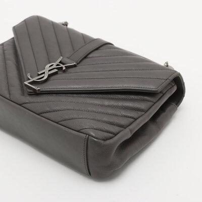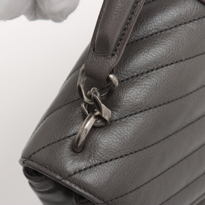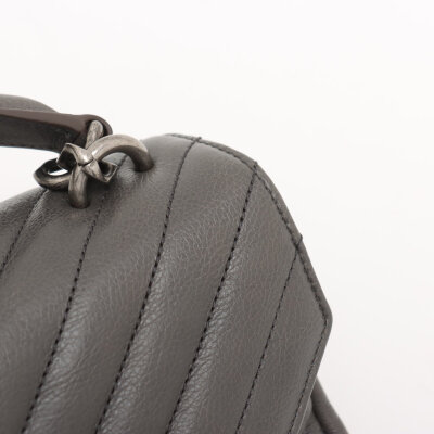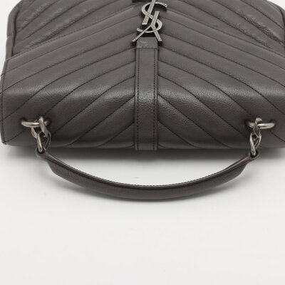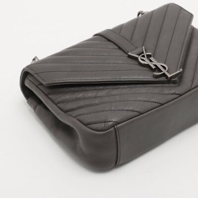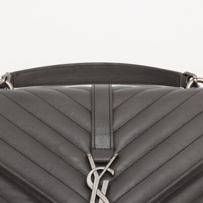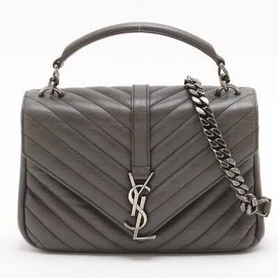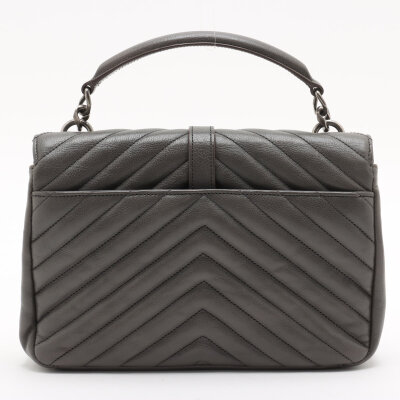 Saint Laurent medium College bag in grey chevron-quilted calfskin leather. Featuring aged silver-toned hardware, YSL logo plaque at front, leather top handle, detachable leather-chain strap, and an exterior slip pocket at the back. The magnetic button closure opens to a black-textile lined interior with two compartments separated by a zippered pocket in the middle and a card slot at the back. Approximate dimensions: 23.5cm(W) x 16.5cm(H) x 5.5cm(D), with a 6.5cm handle drop and 57.5cm chain strap drop. Accompanied by a Saint Laurent care card. With Entrupy Certificate of Authenticity.