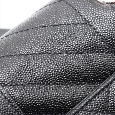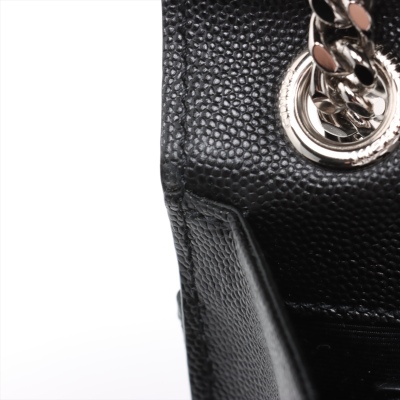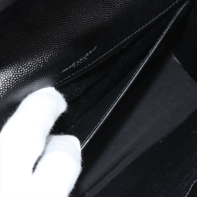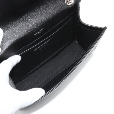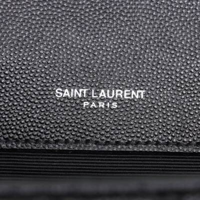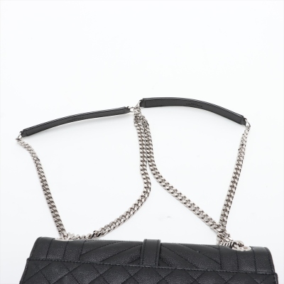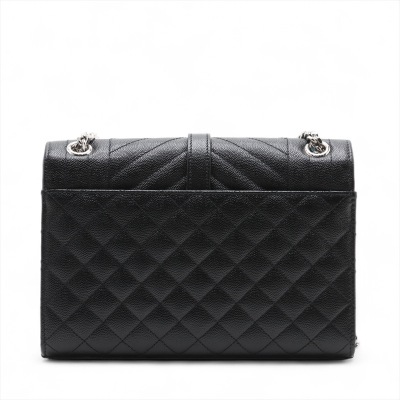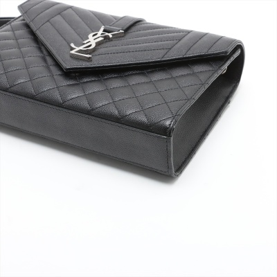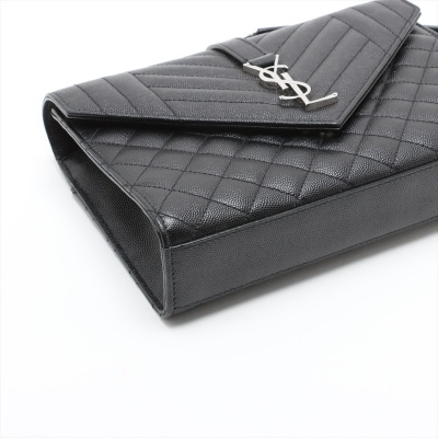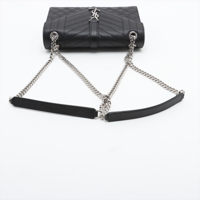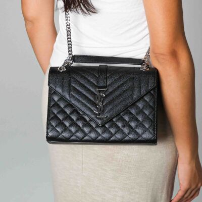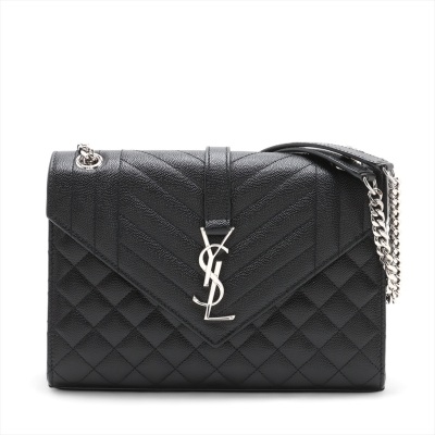 Saint Laurent medium Envelope shoulder bag in black quilted grain De Poudre leather. Featuring silver-toned hardware, exterior back pocket, sliding double chain strap with leather shoulder pads, and envelope flap with YSL monogram. The magnetic closure opens to a black textile interior with a patch pocket. Approximate dimensions: 24cm(L) x 17cm(H) x 6cm(D), shoulder strap drop 31cm. Accompanied by YSL dustbag. With Entrupy Certificate of Authenticity. (Pre-owned)