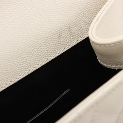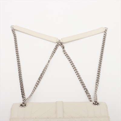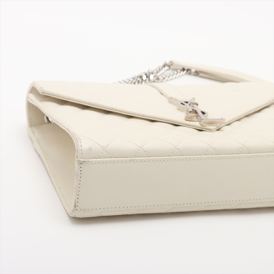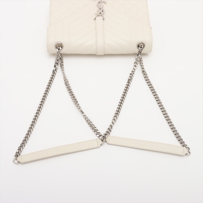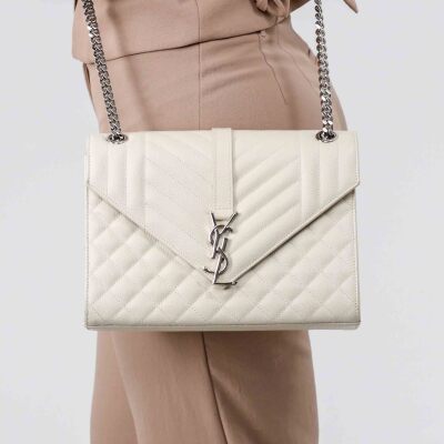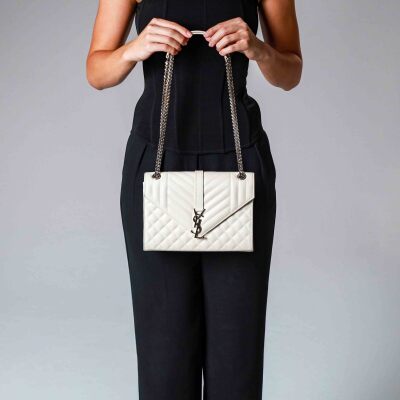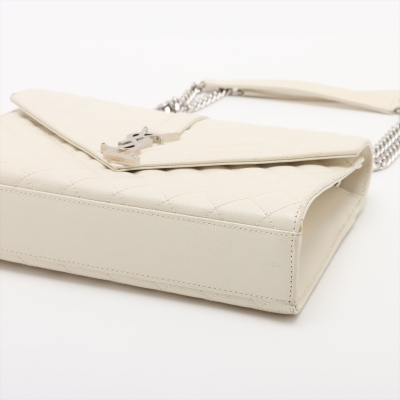 Saint Laurent medium Envelope shoulder bag in white quilted grain De Poudre leather. Featuring silver-toned hardware, exterior back pocket, sliding double chain strap with leather shoulder pads, and envelope flap with YSL monogram. The magnetic closure opens to a black textile interior with a patch pocket. Approximate dimensions: 24cm(W) x 17cm(H) x 6cm(D), shoulder strap drop 31cm. Accompanied by YSL dustbag. With Entrupy Certificate of Authenticity.