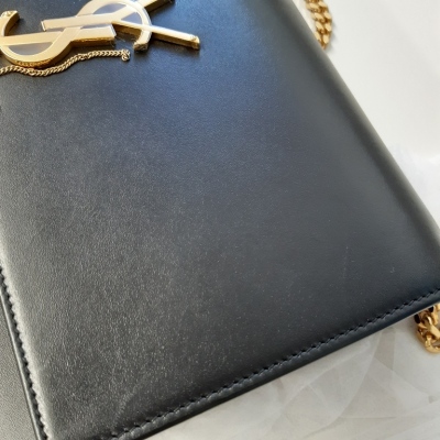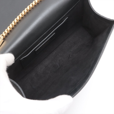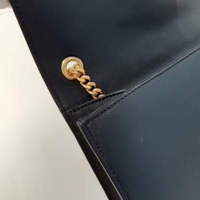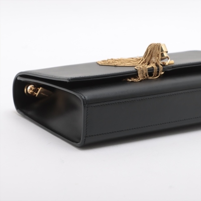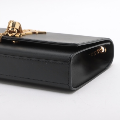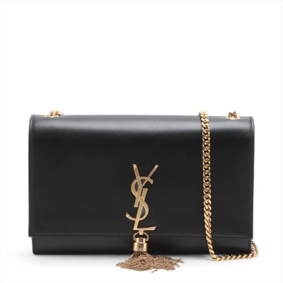 Saint Laurent medium Kate tassel shoulder bag in black smooth leather. Featuring gold-toned hardware, single sliding chain shoulder strap, and gold 'YSL' logo plaque with tassel at front. The flap with magnetic button closure open to a black suede interior with a patch pocket. Approximate dimensions: 24cm(L) x 15cm(H) x 5.5cm(D), single chain drop 49cm. With Entrupy Certificate of Authenticity. (Pre-owned)