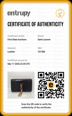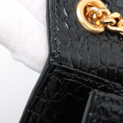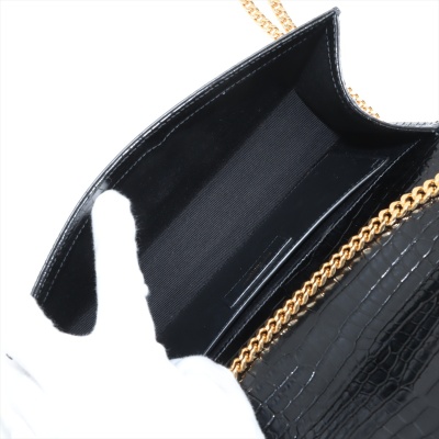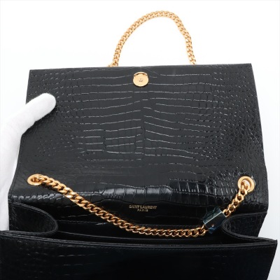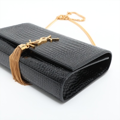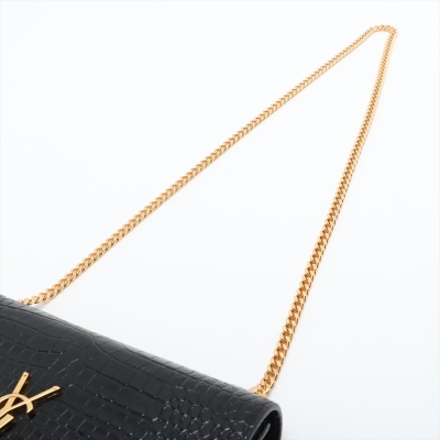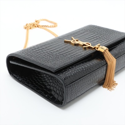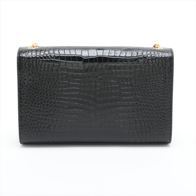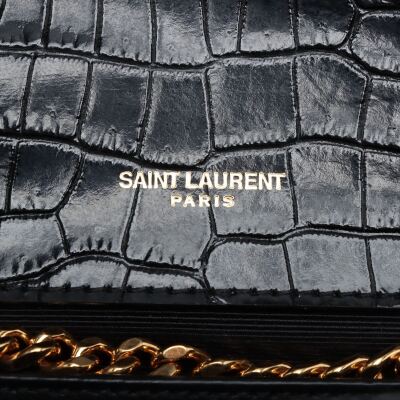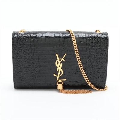 Saint Laurent medium Kate Tassel bag in black Mock Croc embossed calfskin leather with shiny finish. Featuring gold-toned hardware, chain shoulder strap, and 'YSL' logo plaque with chain tassel. The full flap with magnetic button closure opens to a black textile interior with a patch pocket. Approximate dimensions: 24cm(W) x 15cm(H) x 5.5cm(D), with a 48cm strap drop. Accompanied by Saint Laurent RFID info cards, and a dustbag. With Entrupy Certificate of Authenticity.