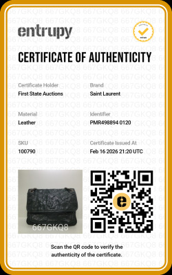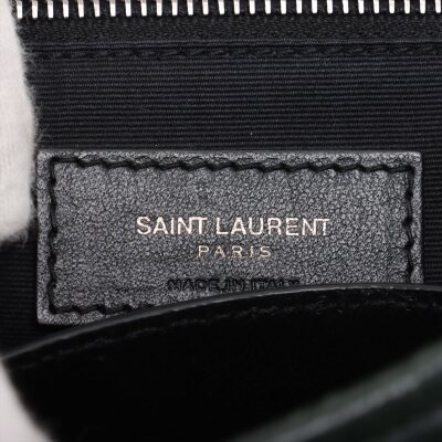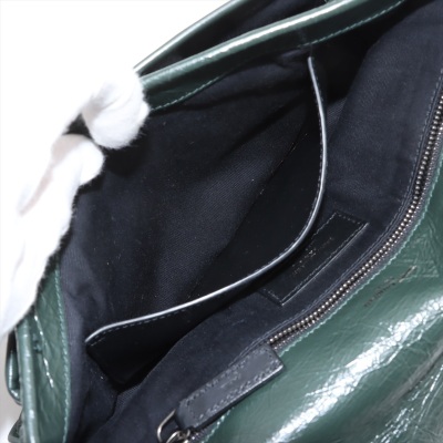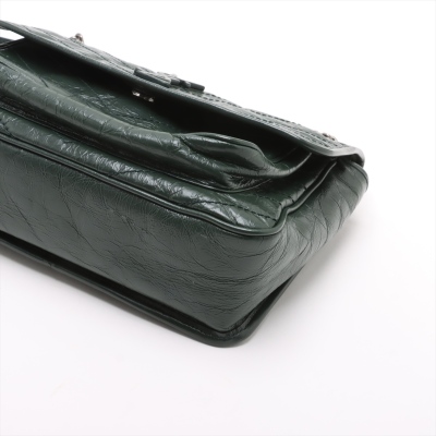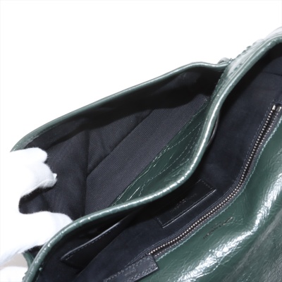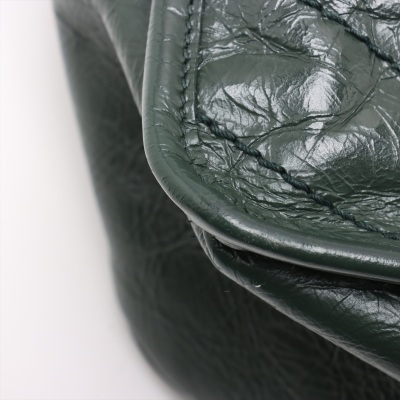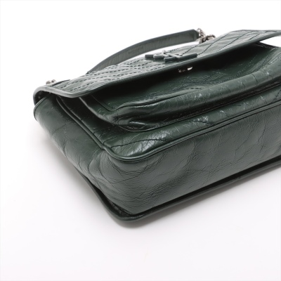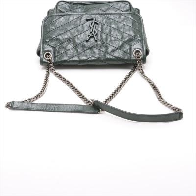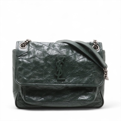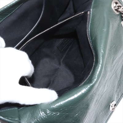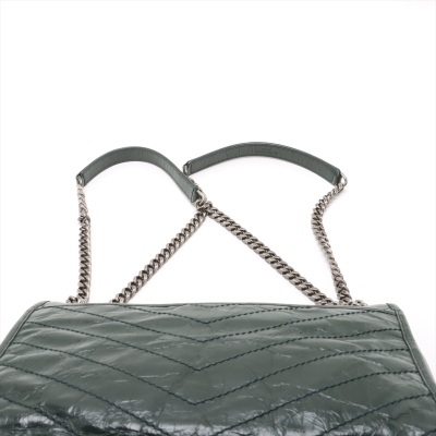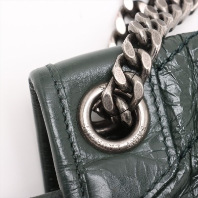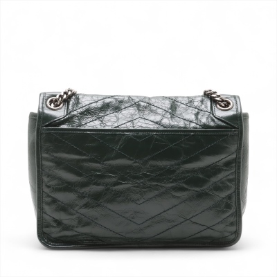 Saint Laurent medium Niki chain bag in shiny dark green crinkled leather. Featuring antique silver-toned hardware, chevron stitches, two external pockets under flap and at rear, and a front flap with matching green leather YSL logo detail with magnetic closure. It opens to a black textile lined interior with zippered and patch pockets. Approximate dimensions: 28cm(W) x 20cm(H) x 9cm(D), with a 29cm sliding double chain drop. With Entrupy Certificate of Authenticity.