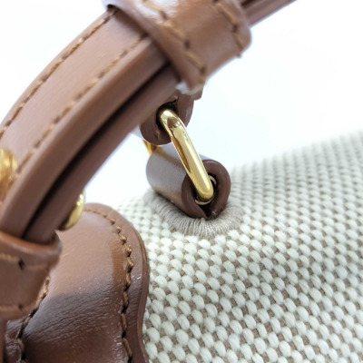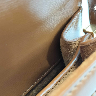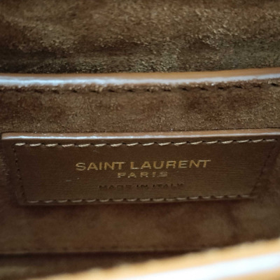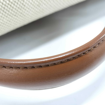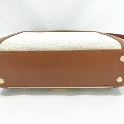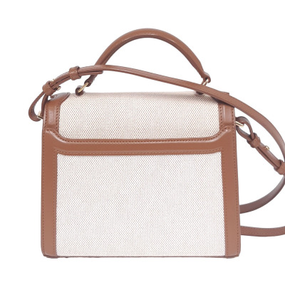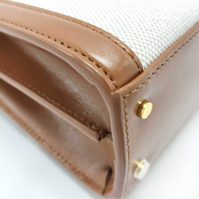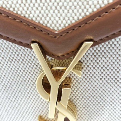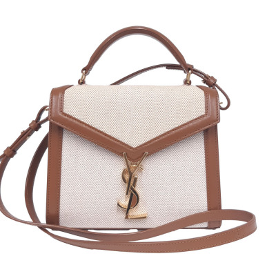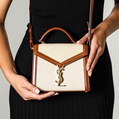 Saint Laurent Paris Cassandra Mini top handle bag in beige canvas & brown leather. Featuring an exterior pocket at the back, a single leather top handle, gold-toned hardware, frontal flap with pivoting YSL closure. It opens to a brown suede interior with 2 compartments and a patch pocket. Approx. dimensions: 20cm(B-L) x 18cm(H) x 7cm(D), 7cm handle drop and 51cm leather strap. With Entrupy Certificate of Authenticity. (Pre-owned)