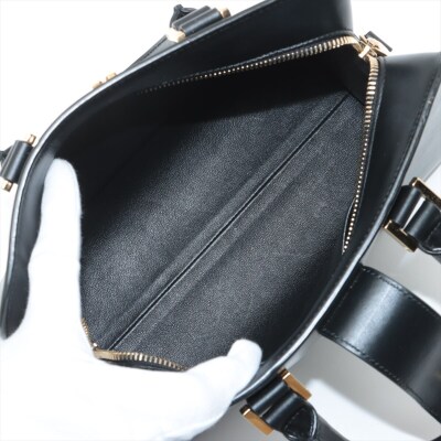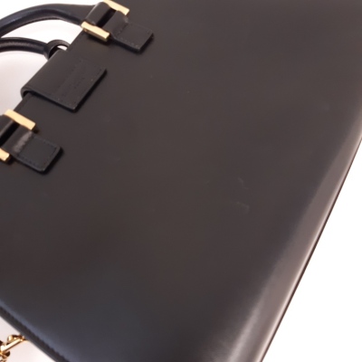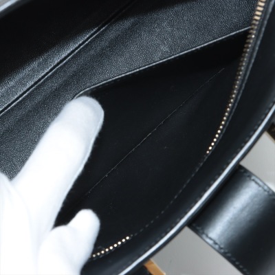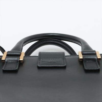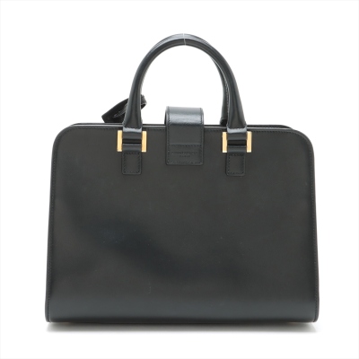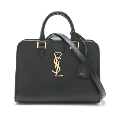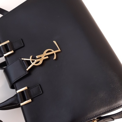 Saint Laurent Paris Baby Cabas handbag in black smooth calfskin leather. Featuring gold-toned hardware, dual rolled top handles, and 'YSL' hardware logo on fold over strap at front. It with the zip closure opens to a black leather interior with a patch pocket. Approximate dimensions: 26cm(L) x 19cm(H) x 13cm(D), handle drop 7cm, detachable shoulder strap drop 54cm. With Entrupy Certificate of Authenticity. (Pre-owned)