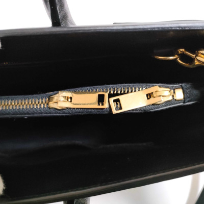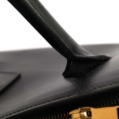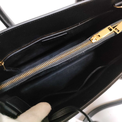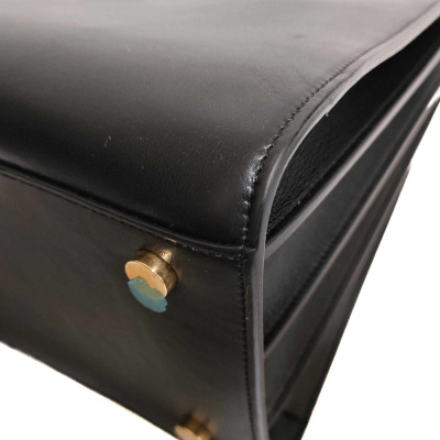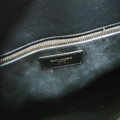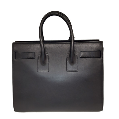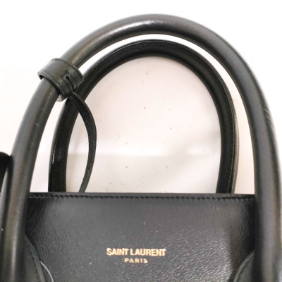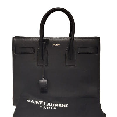 Saint Laurent small Sac de Jour handbag in black smooth leather. Featuring silver-toned hardware, dual top leather handles, accordion sides, and leather encased padlock. The top opens to a black suede interior with two main compartments, divided by a centre zip pocket. Approximate dimensions: 32cm(L) x 25cm(H) x 15cm(D), handle drop 10cm, detachable leather strap drop 48cm. Accompanied by padlock, keys, dustbag. With Entrupy Certificate of Authenticity. (Pre-owned)