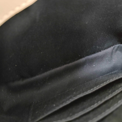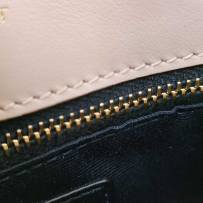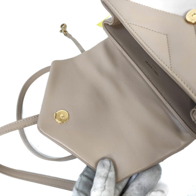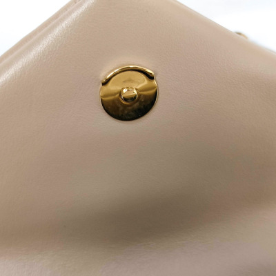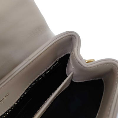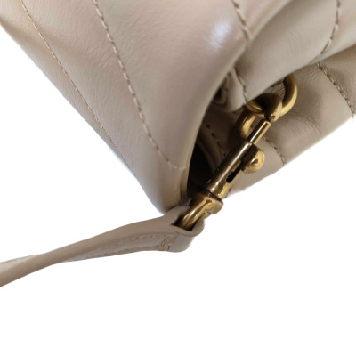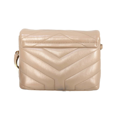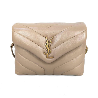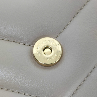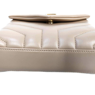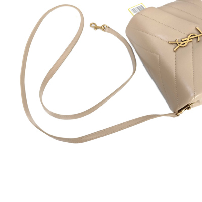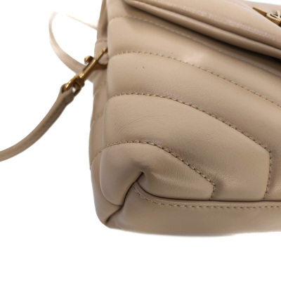 Saint Laurent Toy LouLou shoulder bag in beige chevron-quilted calfskin leather. Featuring antique gold-toned hardware, detachable leather shoulder strap, and YSL metal logo on front flap. The magnetic button closure opens to a black textile interior with two compartments with patch and zip pockets. Approximate dimensions: 19cm(L) x 14cm(H) x 7cm(D), strap drop 55cm. With Entrupy Certificate of Authenticity. (Pre-owned)