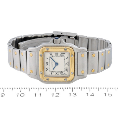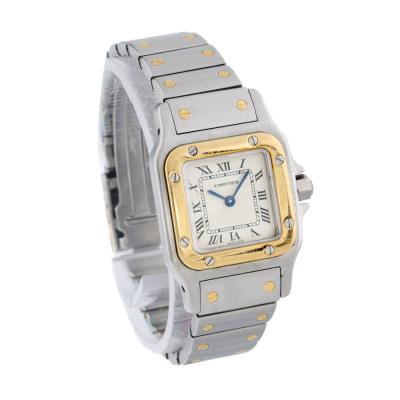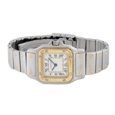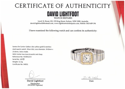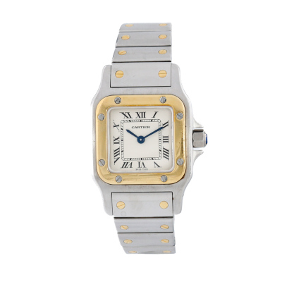 Santos De Cartier Galbee 18ct yellow gold & stainless steel quartz ladies watch. Silver dial, case diameter: 34.8mm x 23.6mm, max wrist size: 15cm, Swiss made. Ref# W20012C4. With Cartier two-tone bracelet and clasp. With Certificate of Authenticity, Cartier Valuation dated 9/5/2025, Cartier International Service booklet dated 16/3/2007, Cartier Invoice of Complete service dated 23/4/2025 and Cartier pouch. Balance of 24 month Complete service from the date of full service.