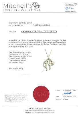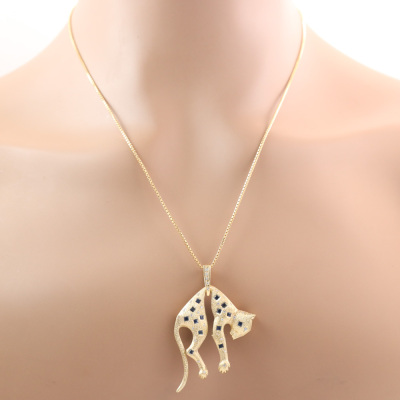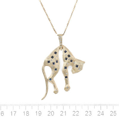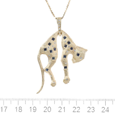 Panther design pendant with carre cut Natural Blue Sapphires totalling 0.85ct and round Natural Diamonds totalling 0.21ct. 18ct yellow gold and 59cm 18ct yellow gold chain. Weight: 30.2g. With Certificate #419988. (Pre-owned)