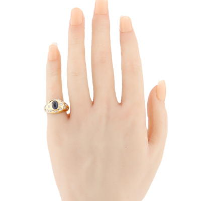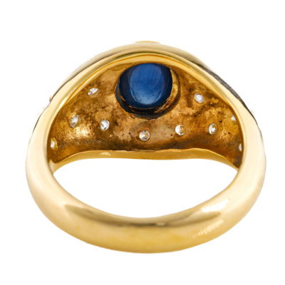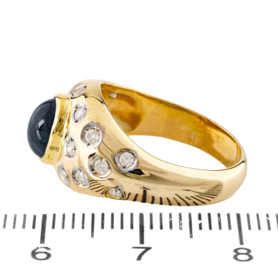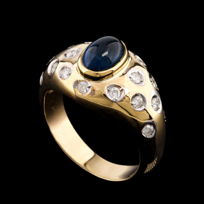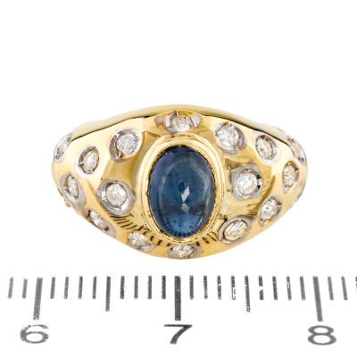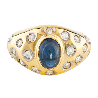 Sapphire and Diamond ring with oval cabochon cut Natural blue Sapphire of 1.20ct & 18 round Natural Diamonds totalling 0.34ct (Estimated grading: H-I SI-P2). 18ct yellow gold. Ring J. Band width: 3.5mm - 5.0mm. Weight: 5.7g. (pre-owned)