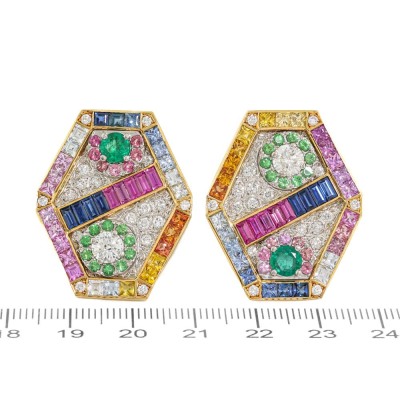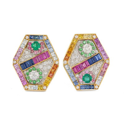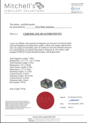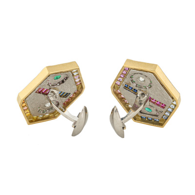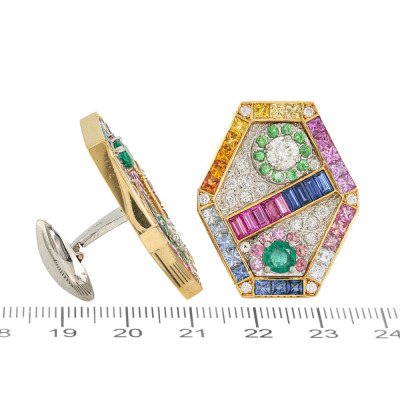 Cufflinks with mixed shape Natural multi-colour Sapphires totalling approximately 7.00ct, 2 round Natural Emeralds totalling 0.93ct & 2 round Natural Diamonds totalling 1.02ct (Estimated grading: G-H P1), 56 round Natural Diamonds totalling approximately 0.56ct (Estimated grading: G-H SI). Platinum - 900 & 18ct yellow gold. Dimensions: 3.1cm x 2.5cm. Weight: 29.9g. With Certificate #421611. (Pre-owned)