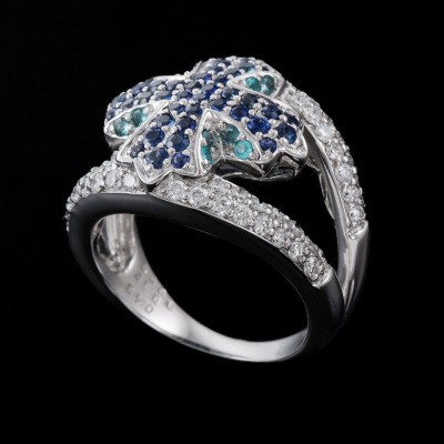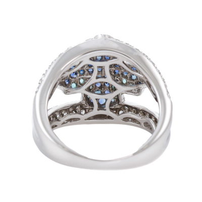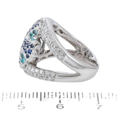 Sapphire, Tourmaline & Diamond Ring with round Natural blue Sapphires totalling 0.43ct, round natural Paraiba Tourmalines totalling 0.12ct and round Natural Diamonds totalling 0.65ct (Estimated grading: G-H SI). 18ct white gold. Band width: 2.4mm - 8.7mm.