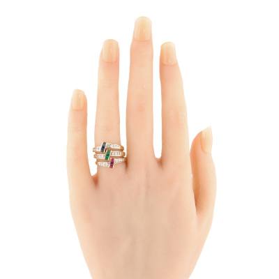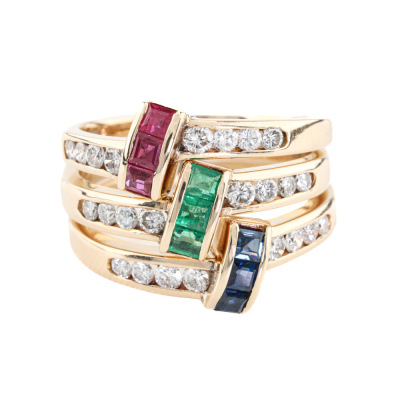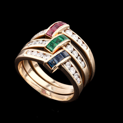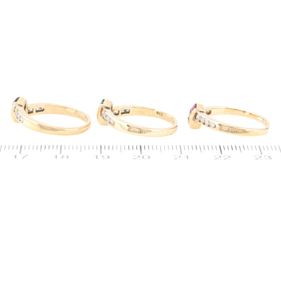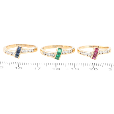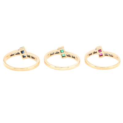 3 stackable rings. 1) Ruby & Diamond ring with carre cut Natural Ruby totalling 0.15ct & round Natural Diamonds totalling 0.15ct. 2) Sapphire & Diamond ring with carre cut Natural Blue Sapphire totalling 0.15ct & round Natural Diamonds totalling approx. 0.15ct. 3) Emerald & Diamond ring with carre cut Natural Emerald totalling approx. 0.09ct & Round Natural Diamonds totalling approx. 0.15ct. Both 14ct Yellow gold. Ring size: M & L3/4. Total Weight: 7.6g (Pre-Owned)