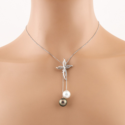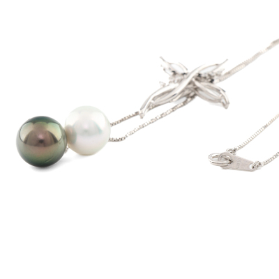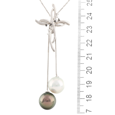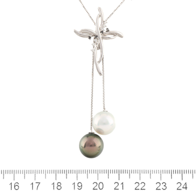 Pearl and Diamond pendant with a Tahitian pearl of 11.3mm, a South Sea pearl of 10.8mm and round natural Black & White Diamonds totalling 0.09ct. 18ct white gold with 18ct white gold adjustable maximum approximately 70cm chain. Weight: 10.7g. (Pre-owned)