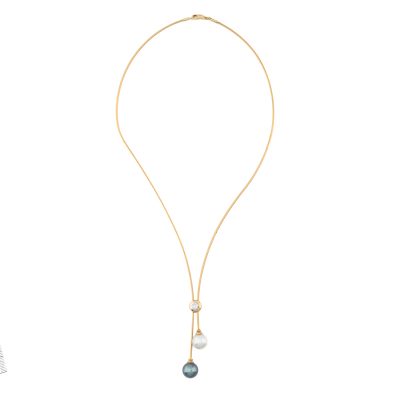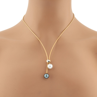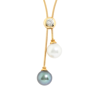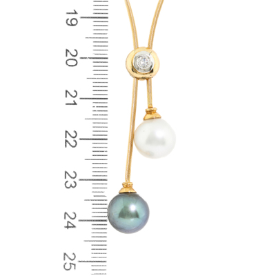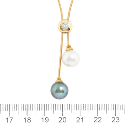 Lariat necklace with a South Sea Pearl of 10.3mm and a Tahitian Pearl of 10.3mm and a round Natural Diamond of approximately 0.12ct. 18ct yellow gold. Maximum inner circumference: 48.5cm. Weight: 9.0g. (Pre-owned)