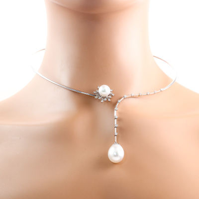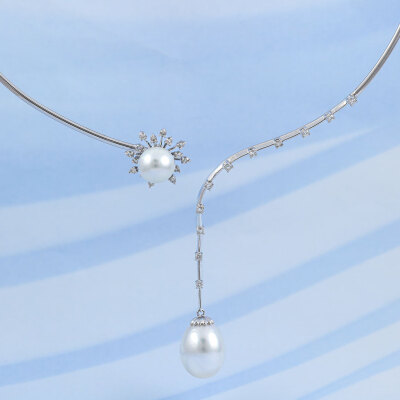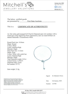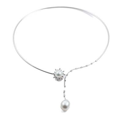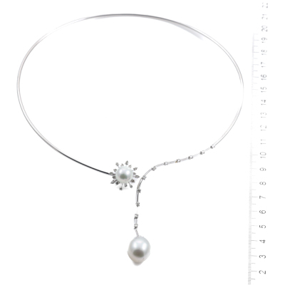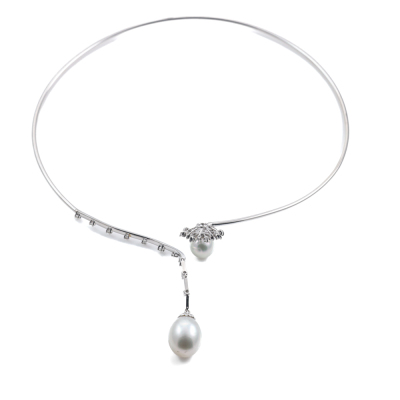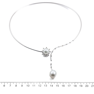 Pearl and Diamond open collar necklace with a drop shape South Sea Pearl of 13.2mm, a round South Sea Pearl of 10.0mm and round Natural Diamonds totalling 0.81ct (Estimated grading: I-J SI-P1). Circumference: 40cm. 18ct white gold. Weight: 21.8g. With Certificate #419780. (Pre-owned)